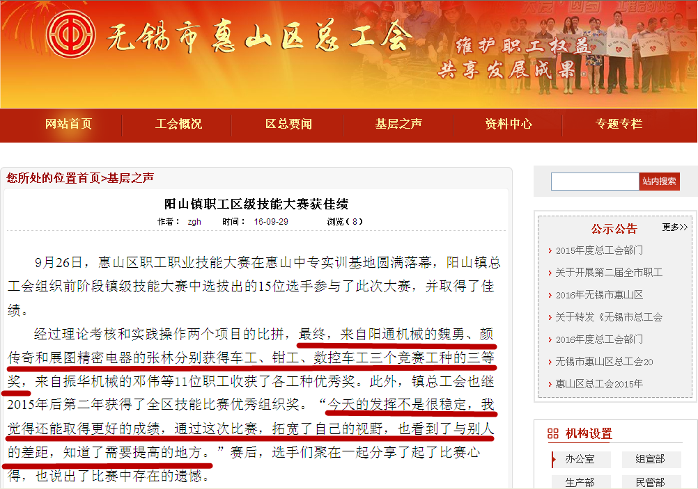 9月26日, 2016年惠山區(qū)職工職業(yè)技能大賽在惠山中等專業(yè)學(xué)校實(shí)訓(xùn)基地鳴鑼開賽; 這次比賽結(jié)束獲獎(jiǎng)的顏傳奇、魏勇在“無錫市惠山區(qū)總工會(huì)”網(wǎng)站上刊登表?yè)P(yáng)。如圖所示